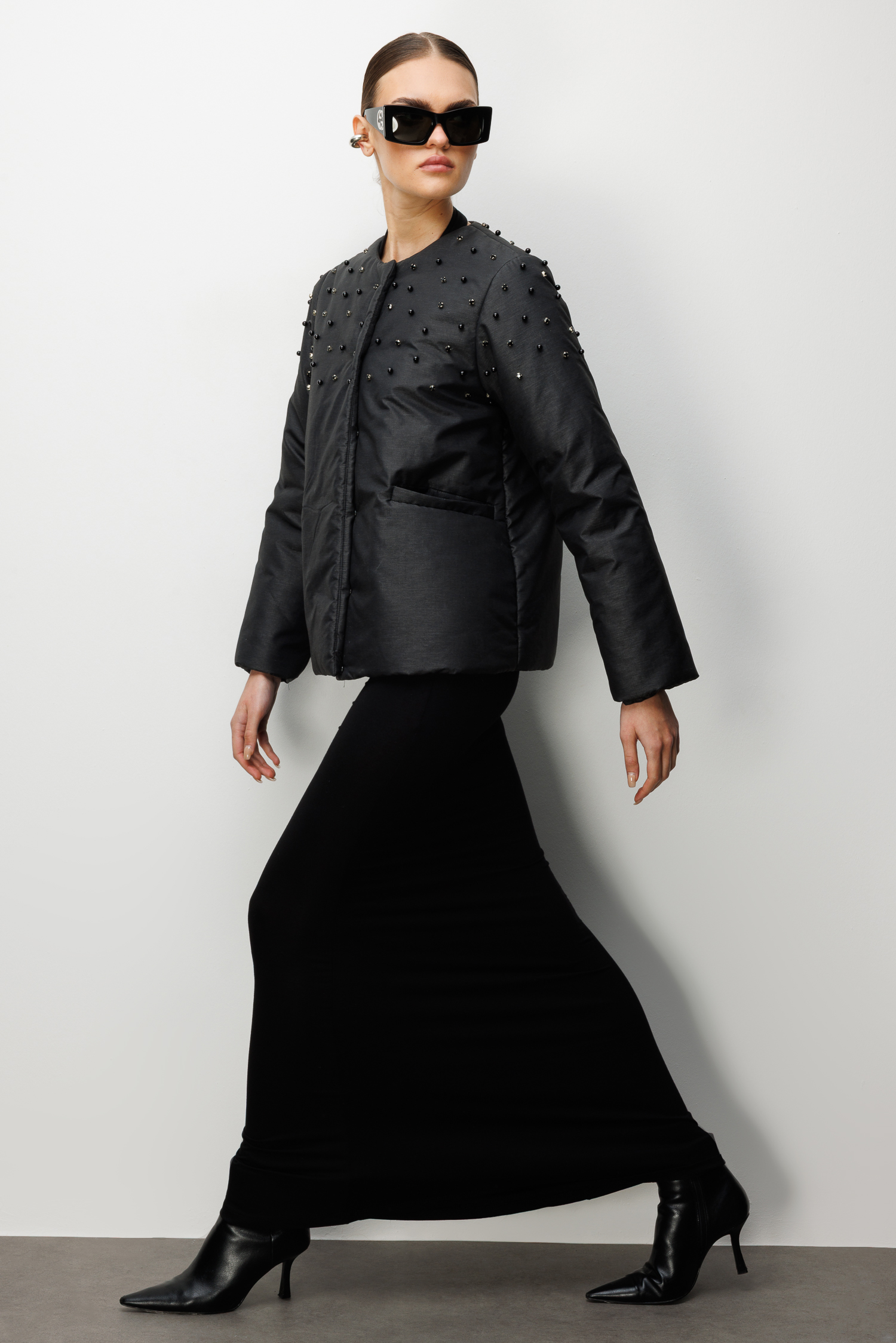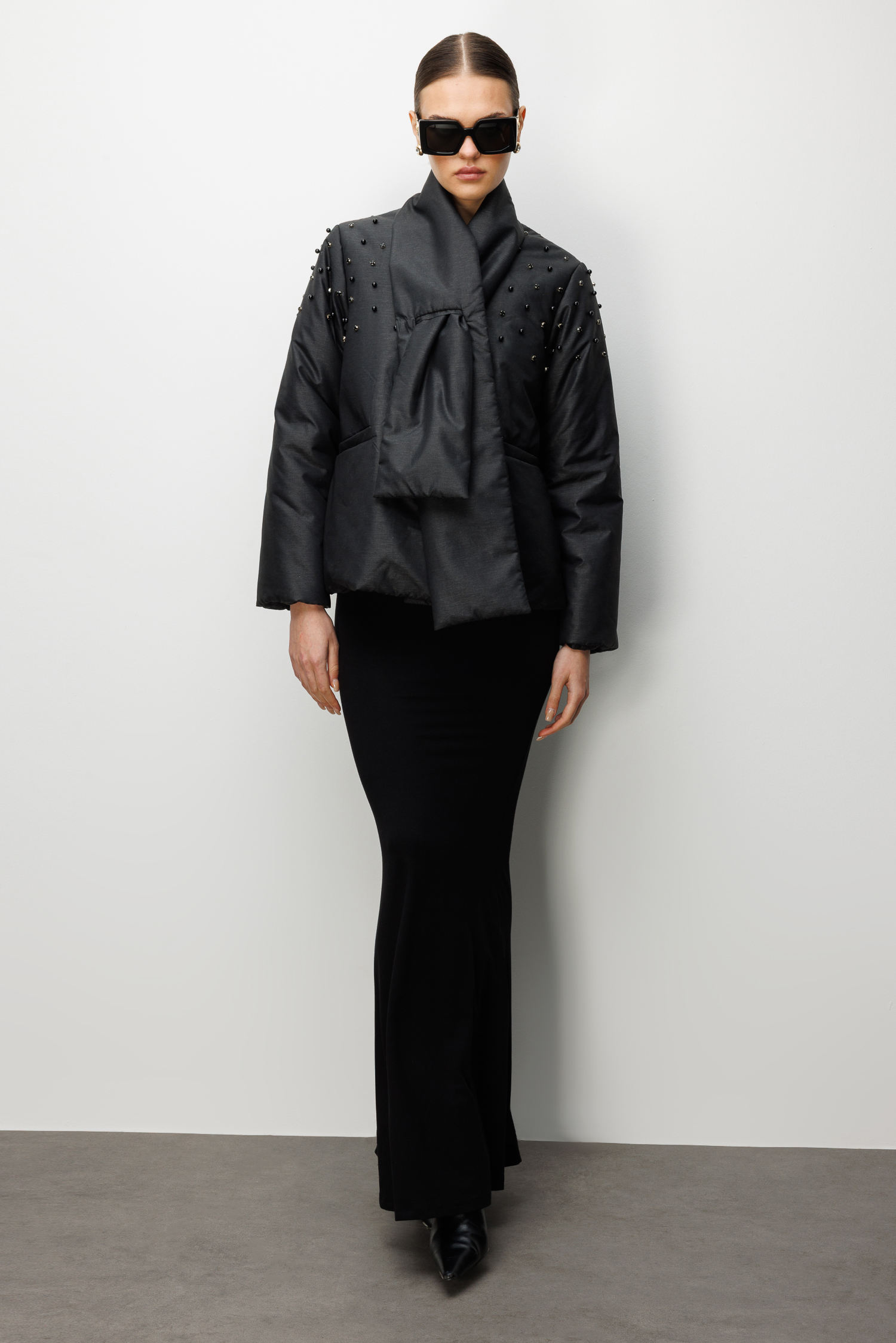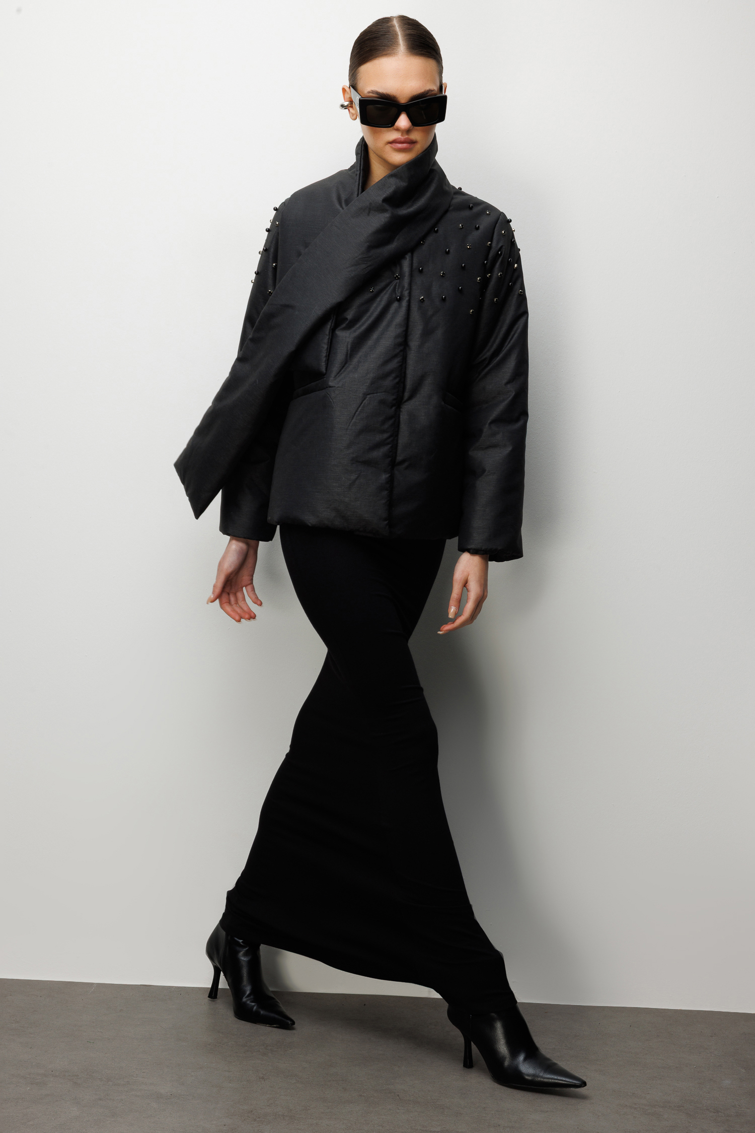 Modern ve sofistike bir duruş sunan bu kapitone mont, omuz ve üst beden boyunca yer alan boncuk detaylarıyla güçlü bir stil vurgusu yapar. Seyyar atkı detayı, tasarıma özgün bir karakter kazandırırken farklı kullanım seçenekleriyle stil çeşitliliği sunar. Rahat kalıbı ve zamansız siyah rengi sayesinde günlük kombinlerden şehir şıklığına kadar geniş bir kullanım alanı sağlar. Minimal ama etkili detaylarıyla öne çıkan bu parça, stilinde fark yaratmak isteyenler için ideal bir tamamlayıcıdır.