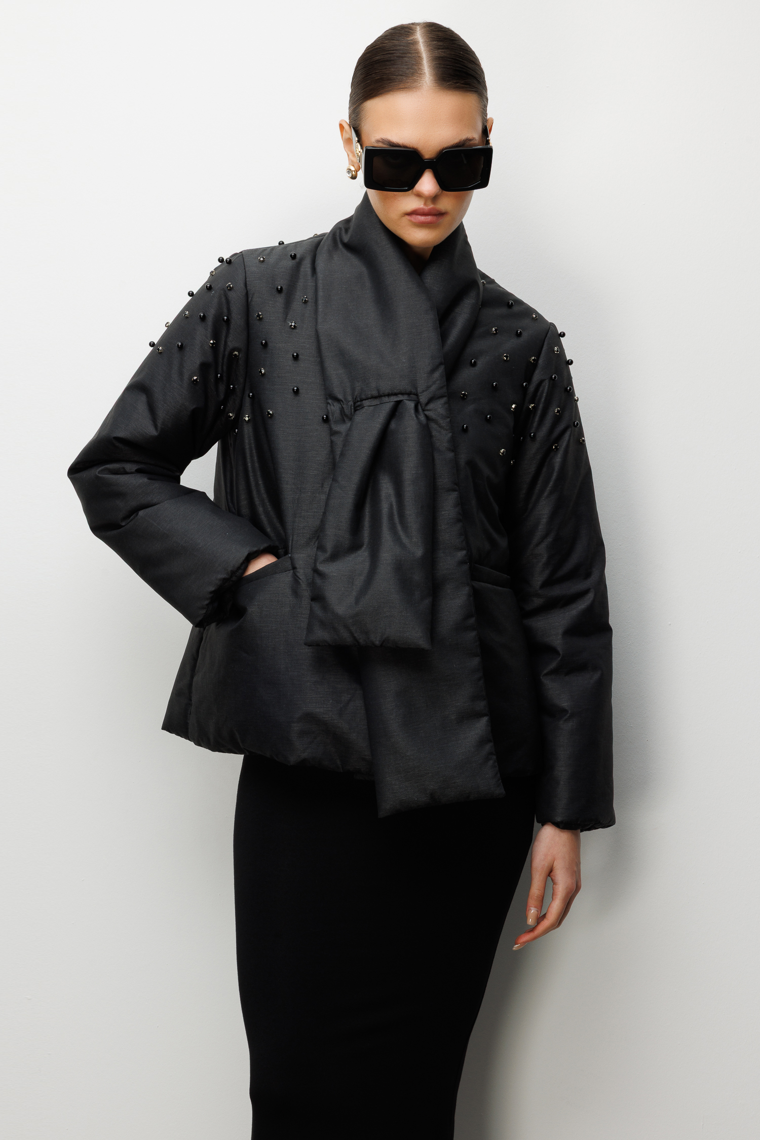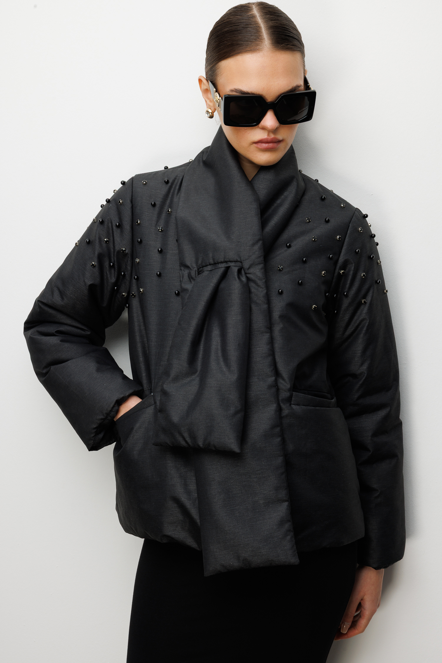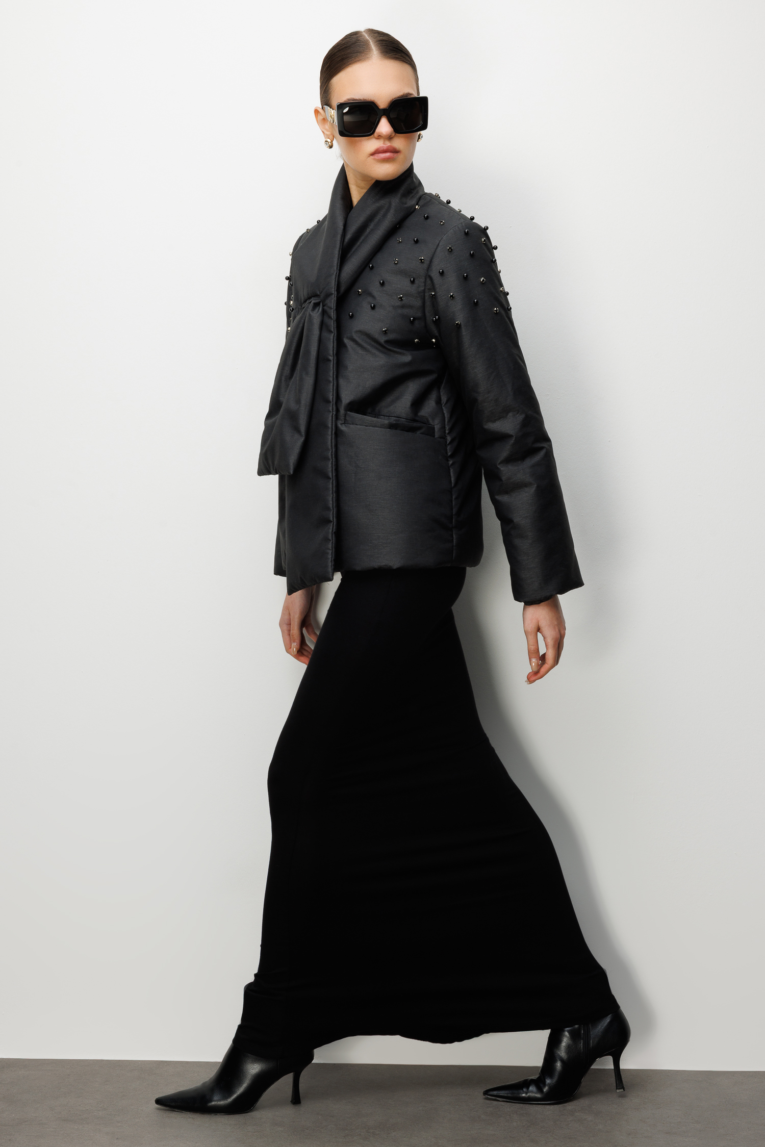 Modern ve sofistike bir duruş sunan bu kapitone mont, omuz ve üst beden boyunca yer alan boncuk detaylarıyla güçlü bir stil vurgusu yapar. Seyyar atkı detayı, tasarıma özgün bir karakter kazandırırken farklı kullanım seçenekleriyle stil çeşitliliği sunar. Rahat kalıbı ve zamansız siyah rengi sayesinde günlük kombinlerden şehir şıklığına kadar geniş bir kullanım alanı sağlar. Minimal ama etkili detaylarıyla öne çıkan bu parça, stilinde fark yaratmak isteyenler için ideal bir tamamlayıcıdır.