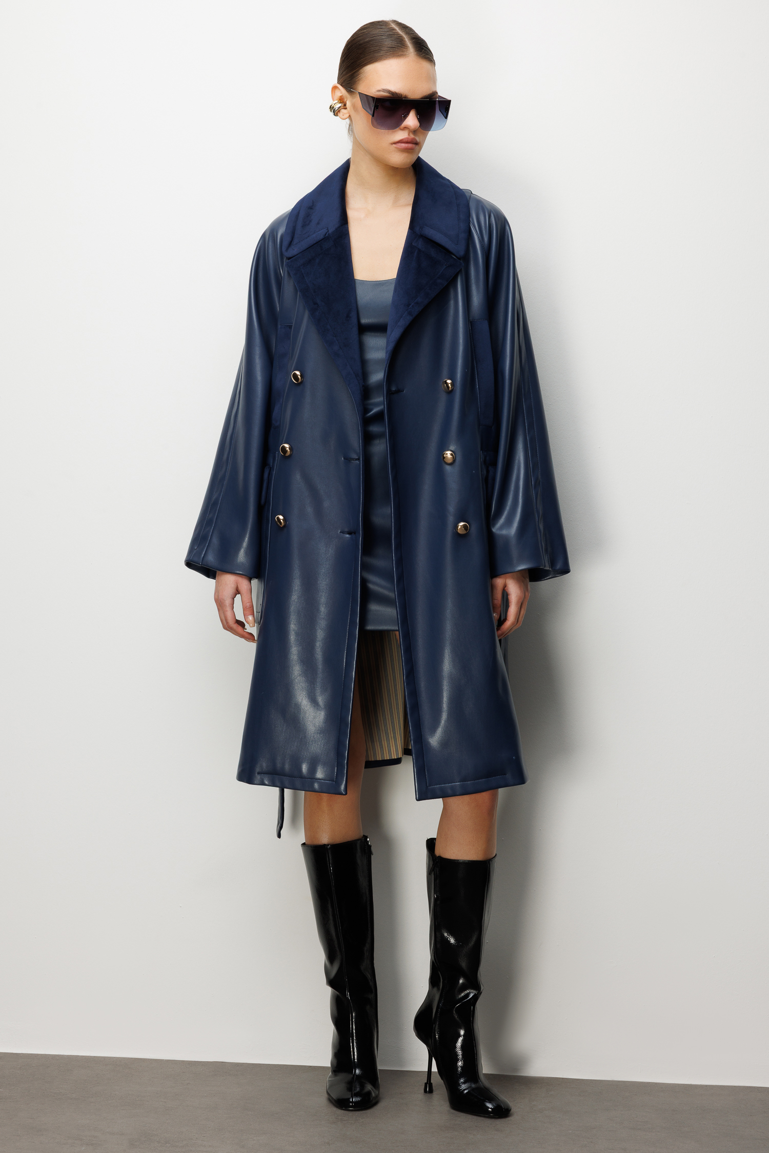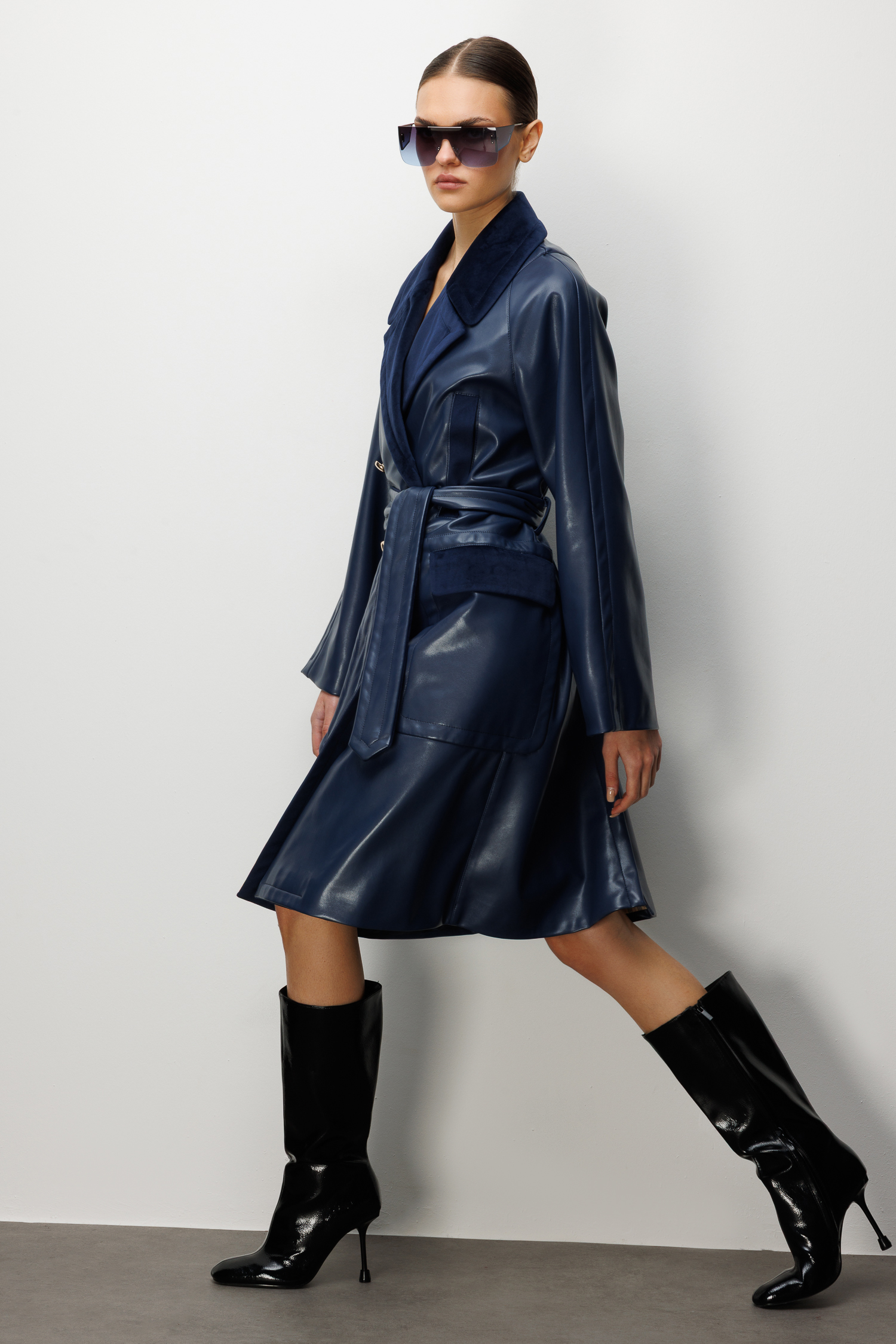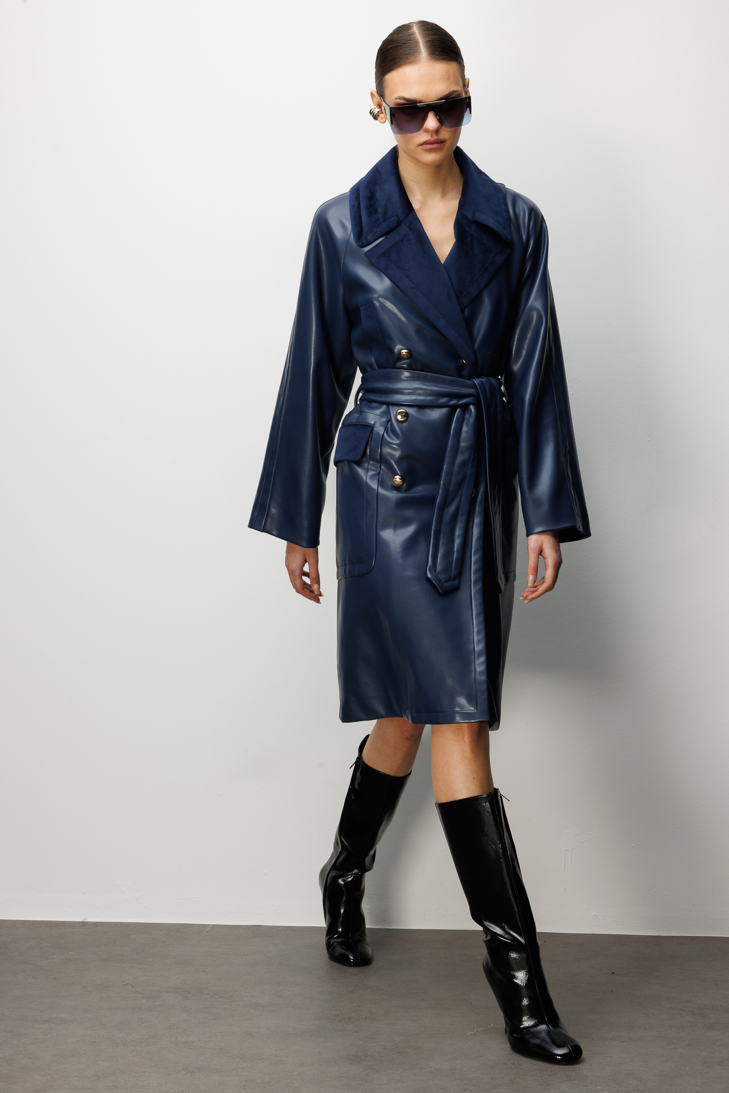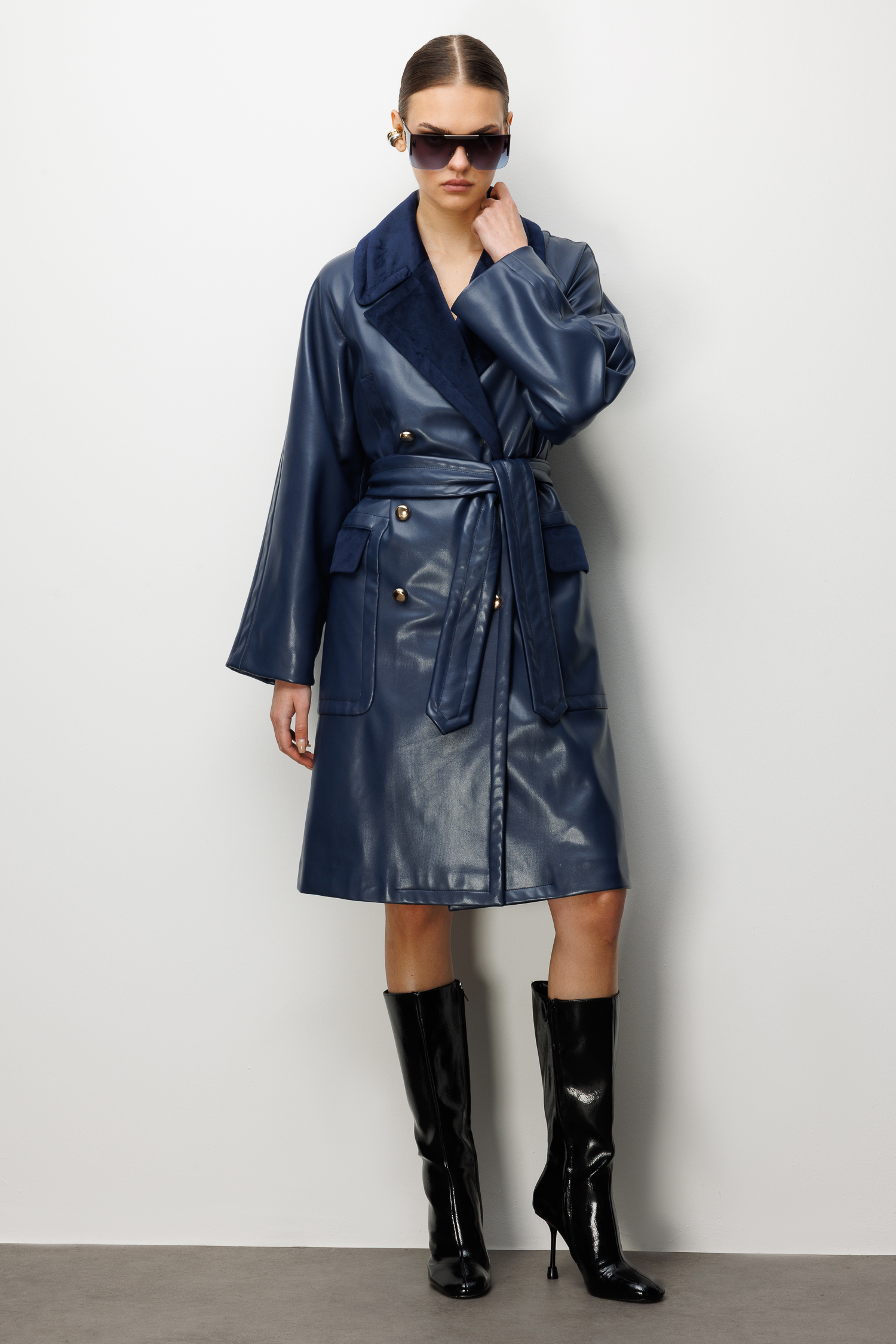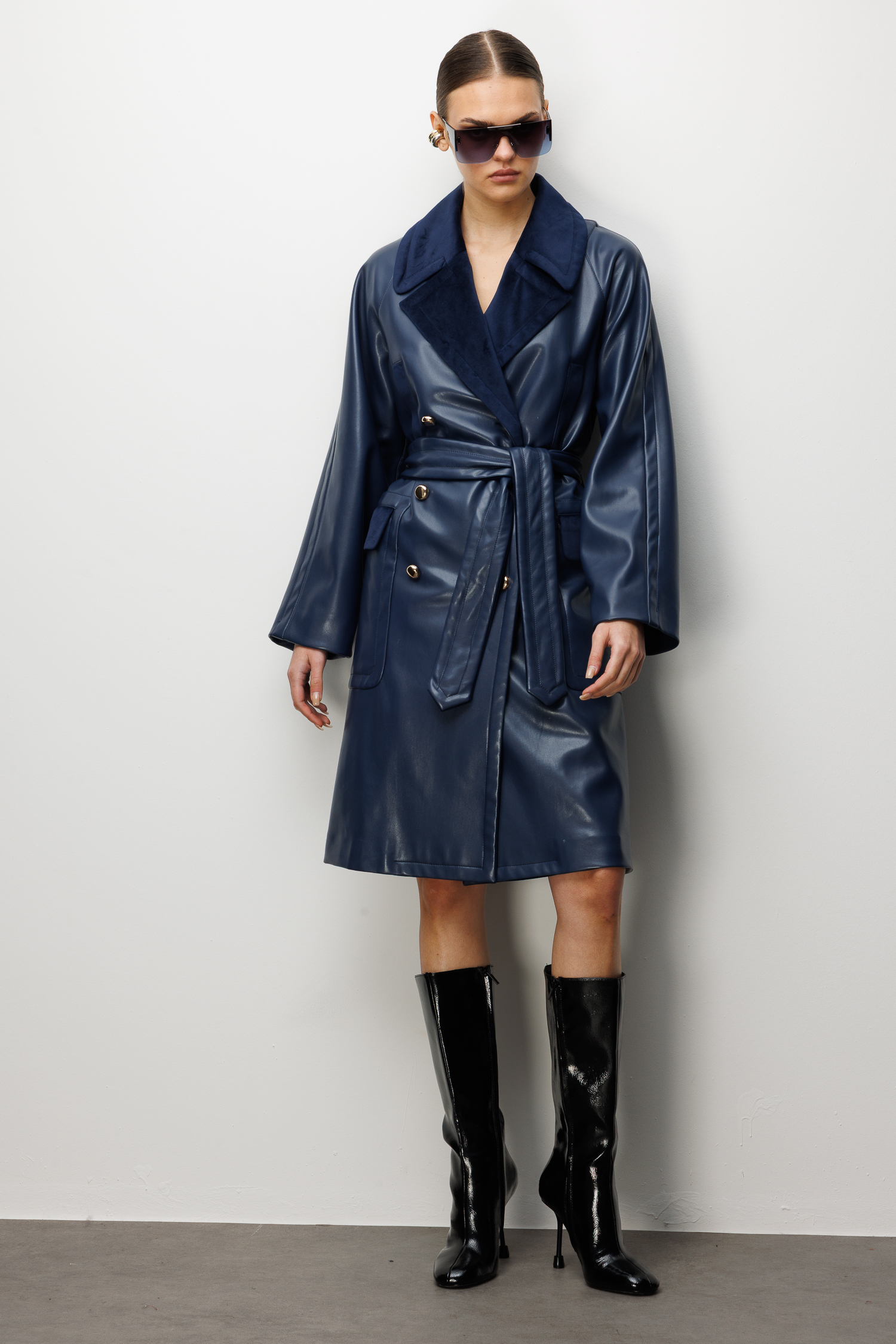Trenç Kadife Yaka Detaylı Kemerli Suni Deri Trençkot 5945