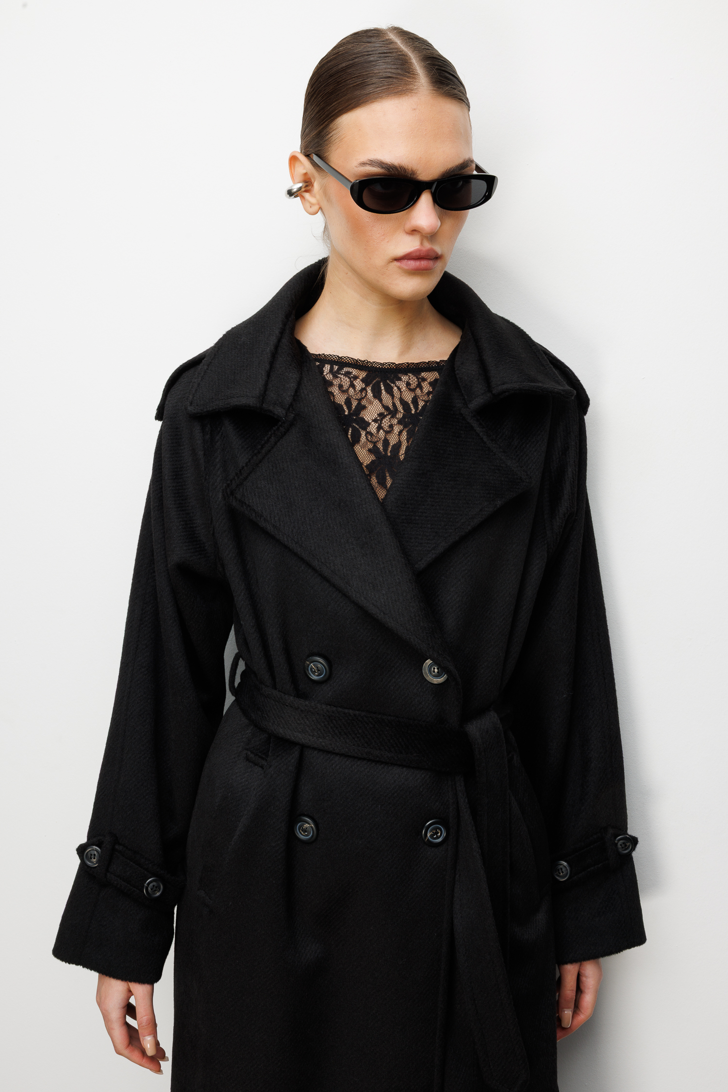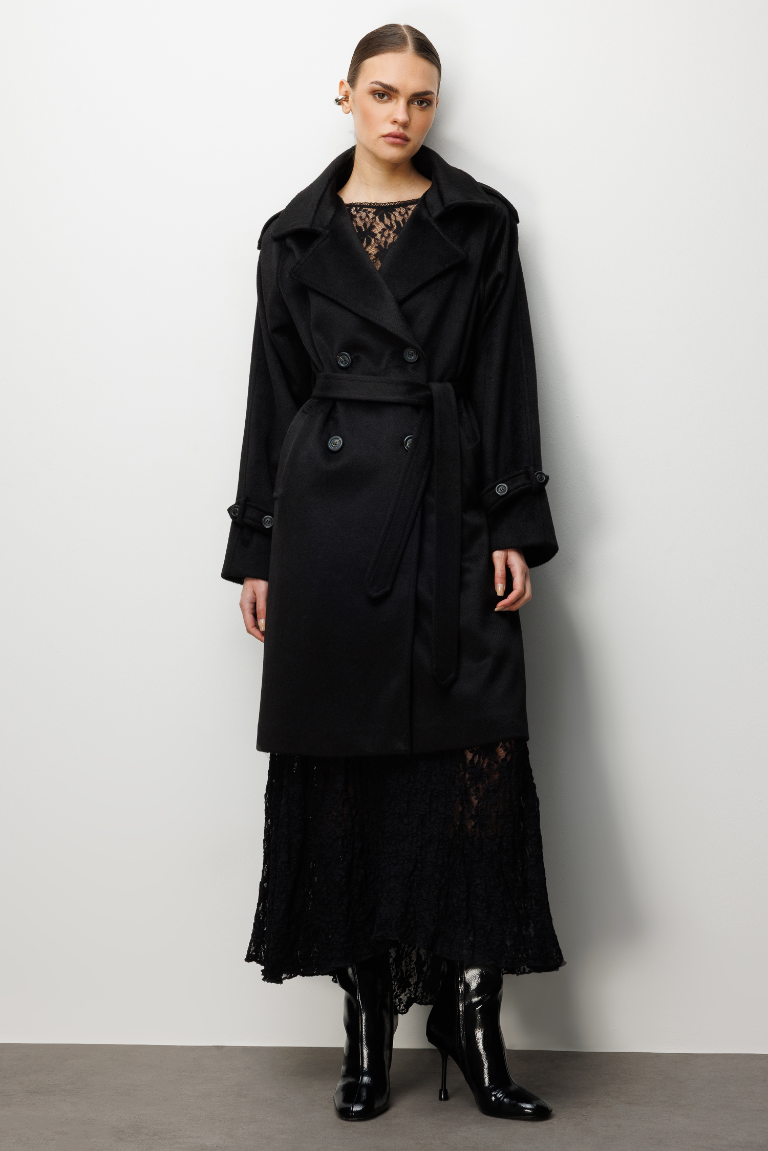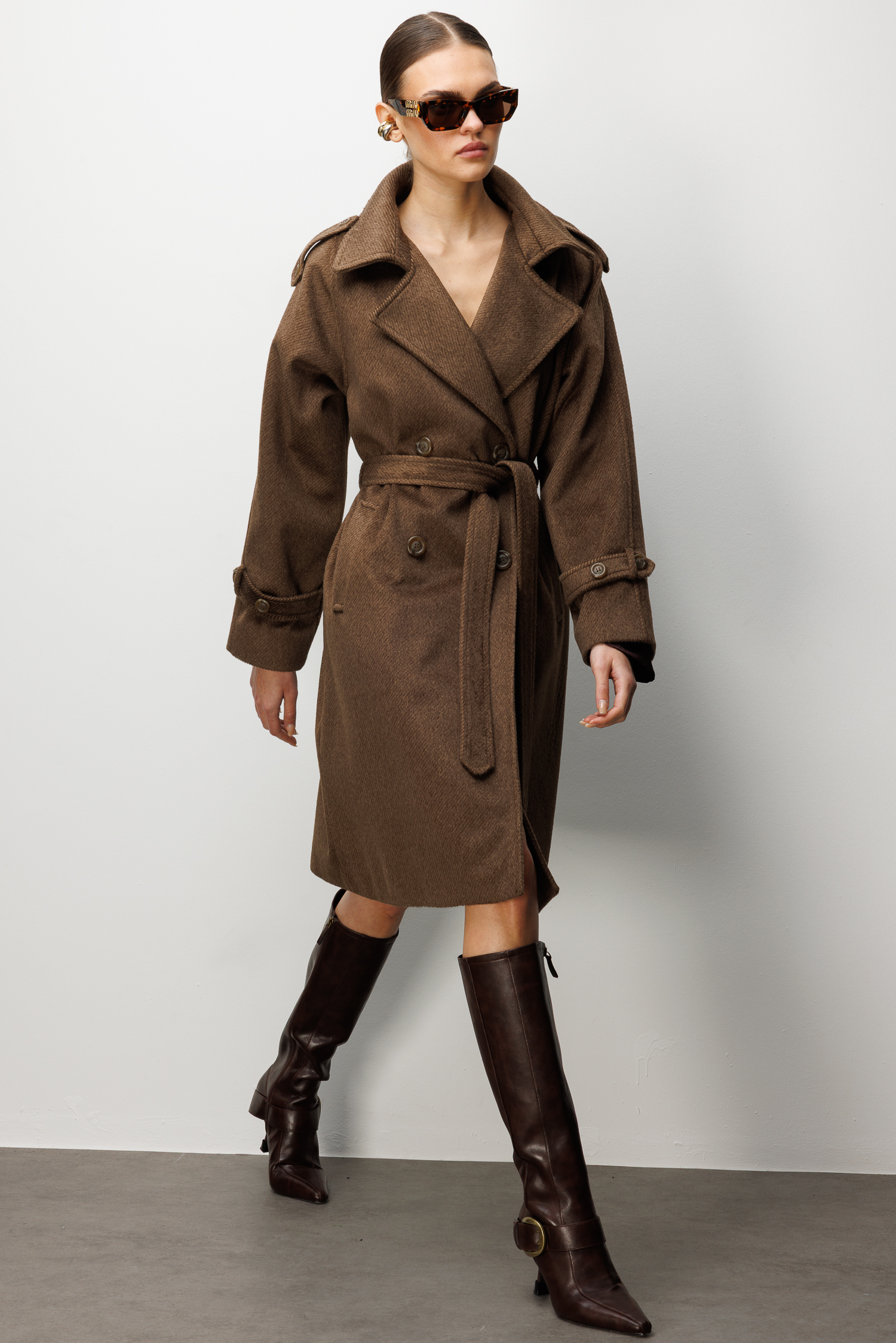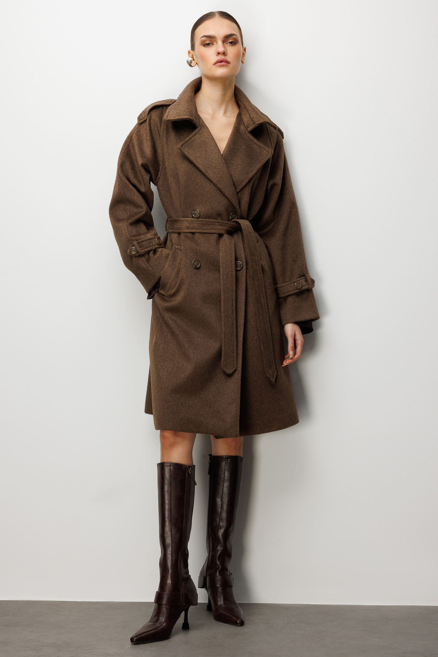 Trençkot esintili kruvaze yaka tasarımı ve belden bağlamalı kuşağıyla şık ve modern bir görünüm sunar. Zamansız kesimi ve düğme detayları sayesinde hem günlük hem de şehir stiline kolayca uyum sağlar.