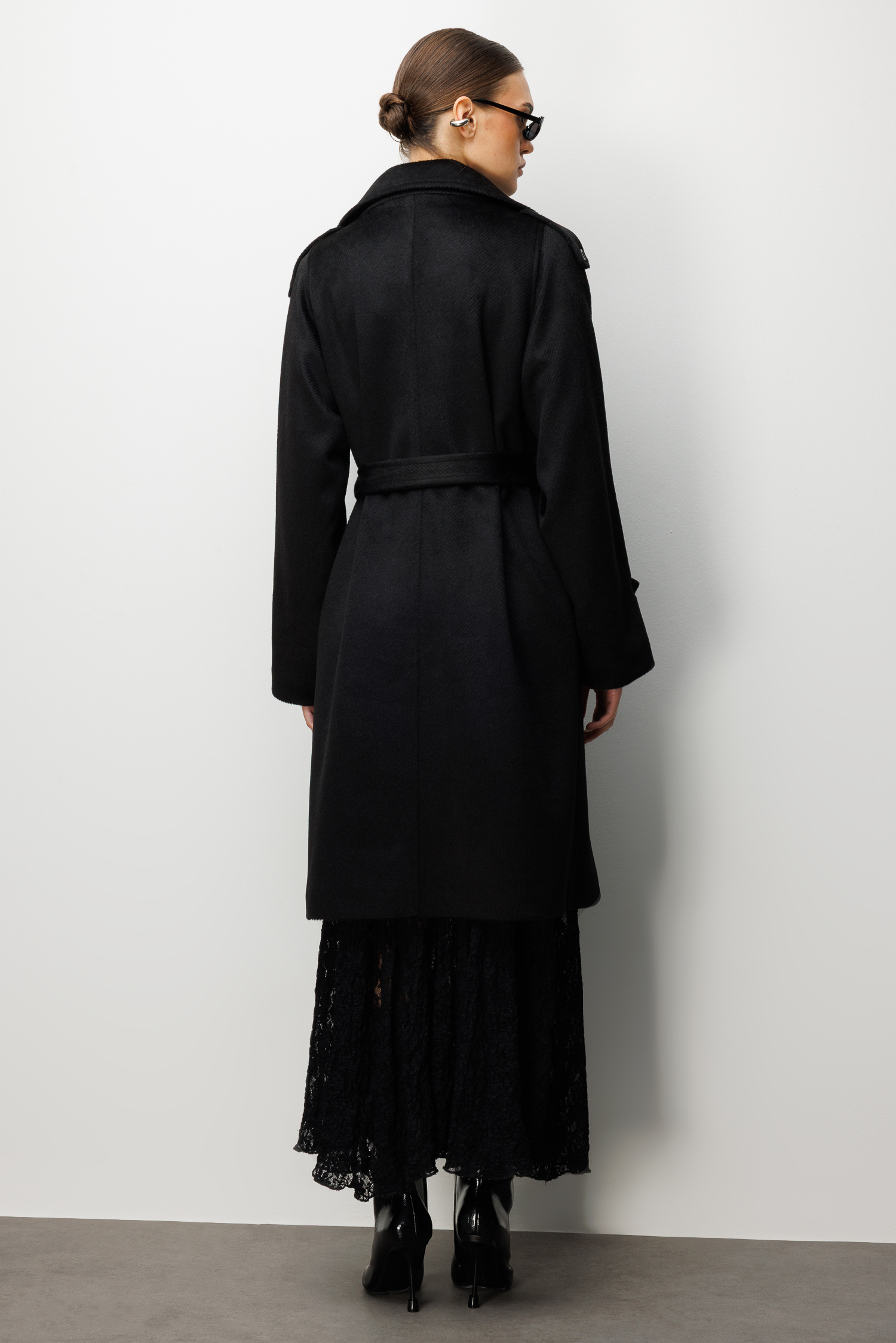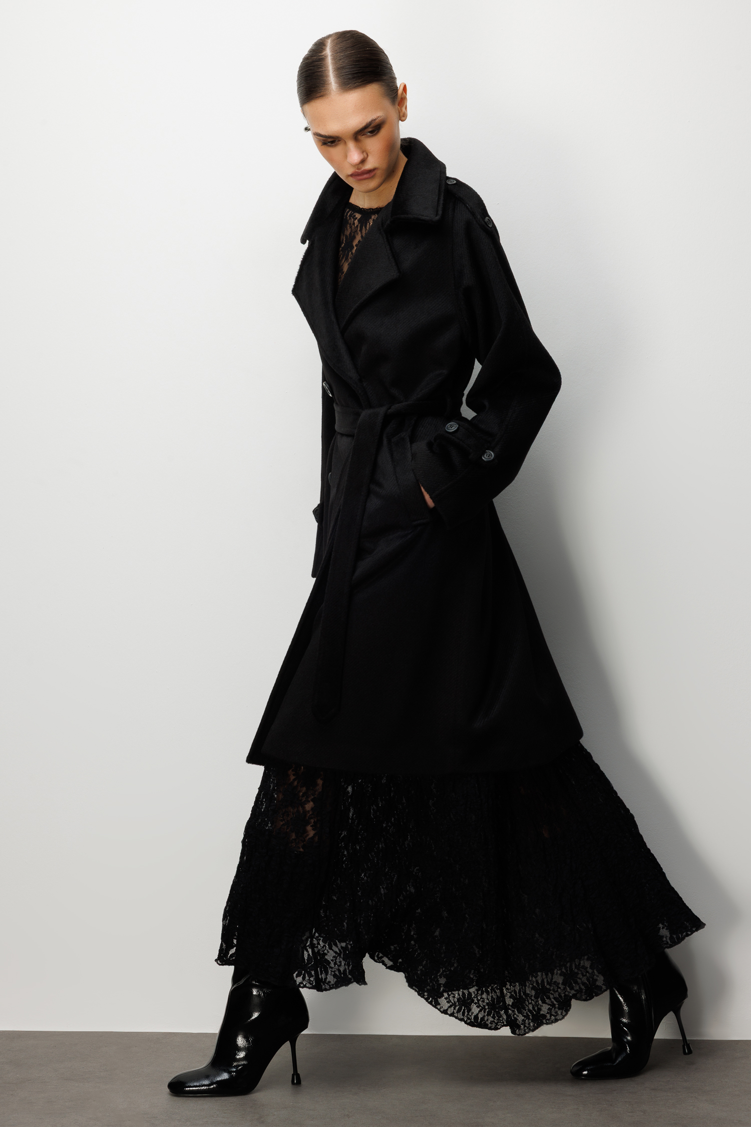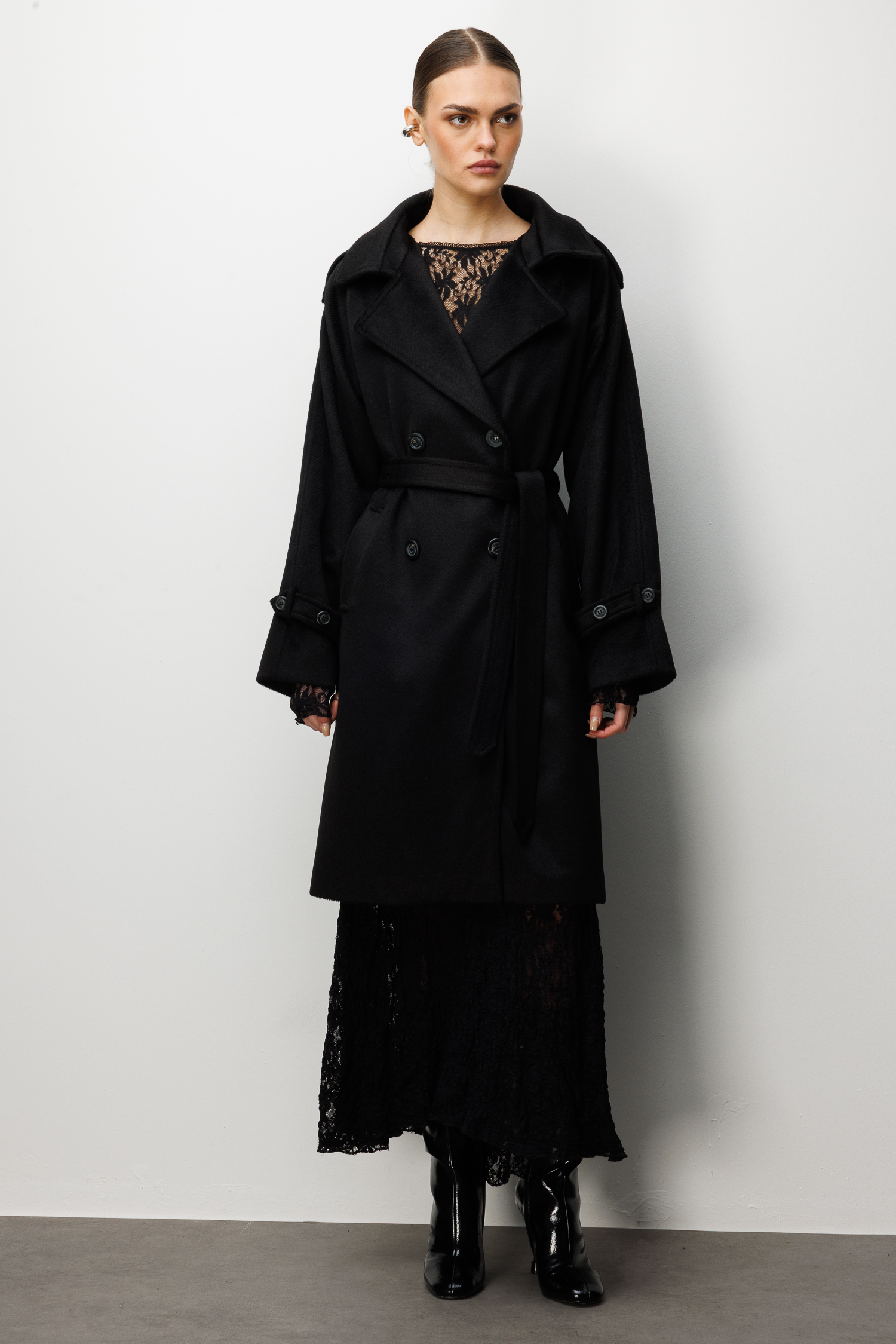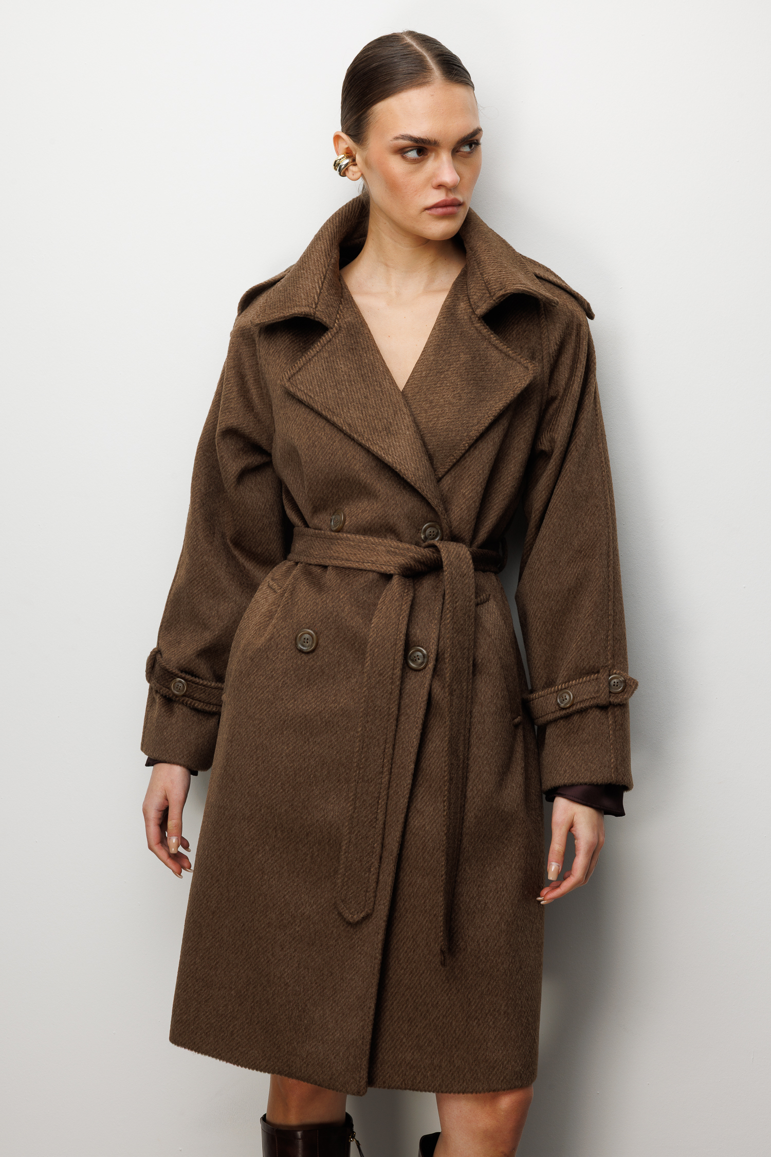 Trençkot esintili kruvaze yaka tasarımı ve belden bağlamalı kuşağıyla şık ve modern bir görünüm sunar. Zamansız kesimi ve düğme detayları sayesinde hem günlük hem de şehir stiline kolayca uyum sağlar.